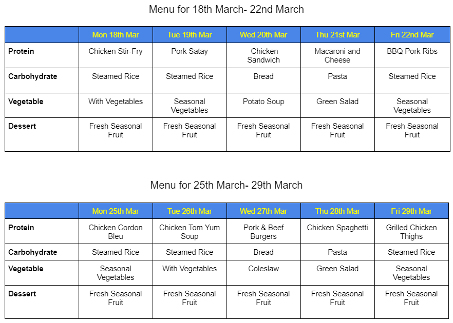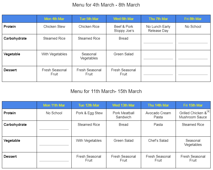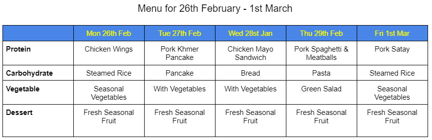 MENU FOR FEBRUARY – MARCH