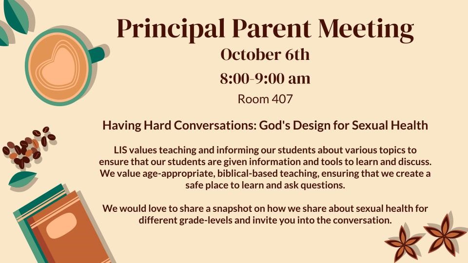 - October 6th – End of Quarter 1; Principal-Parent Meeting