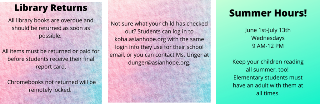 Library books should already be back with the library and any borrowed Chromebooks should now be returned and logged out on a daily basis if needed.