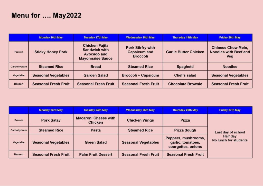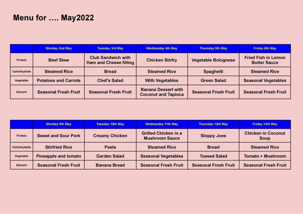 MENU FOR MAY