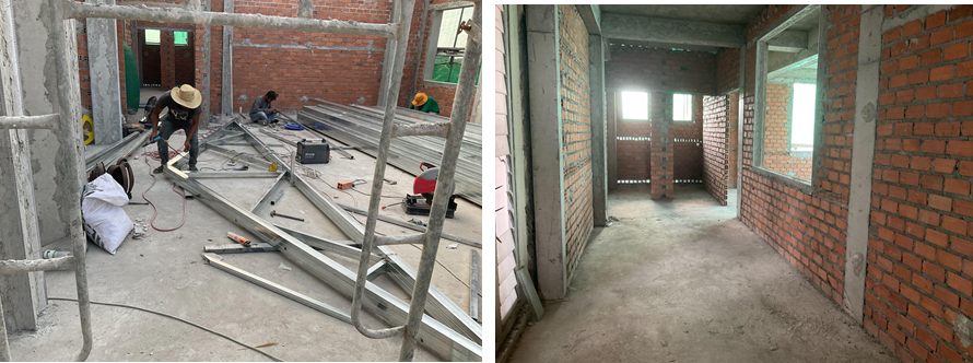 Work on the roofing trusses has just started and meanwhile on the lower floors the plasterer’s are working on the pillars and beams