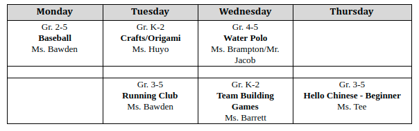 Session #3 of the Elementary After School Program will begin Monday, February 25, and run untilMay 10, for grades K-5. Application forms have been sent home through the classroom teachers. Here are the activities being offered: