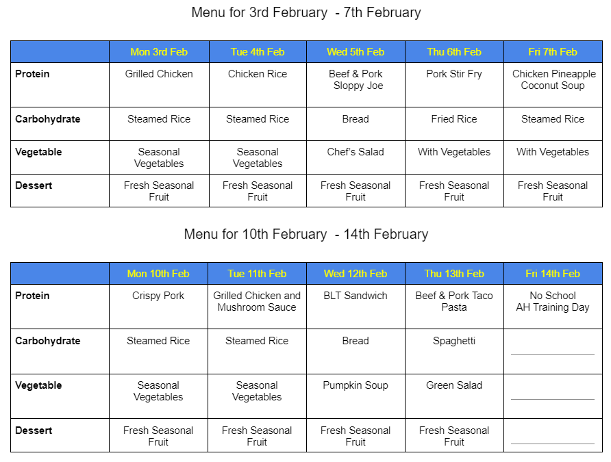 MENU FOR FEBRUARY