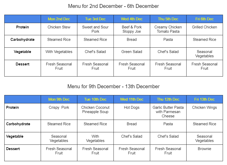 MENU FOR DECEMBER